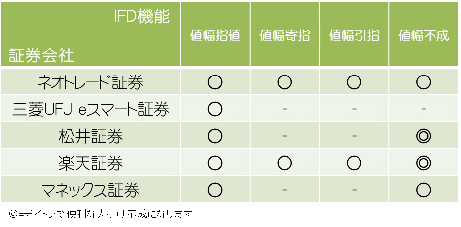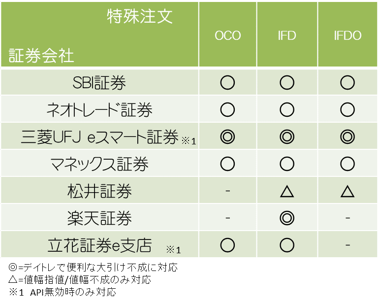 現状IFD/IFDO注文はSBIネオトレード(ライブスター)証券/auカブコム(カブドットコム)証券/立花証券e支店/松井証券/楽天証券/マネックス証券で対応しています。